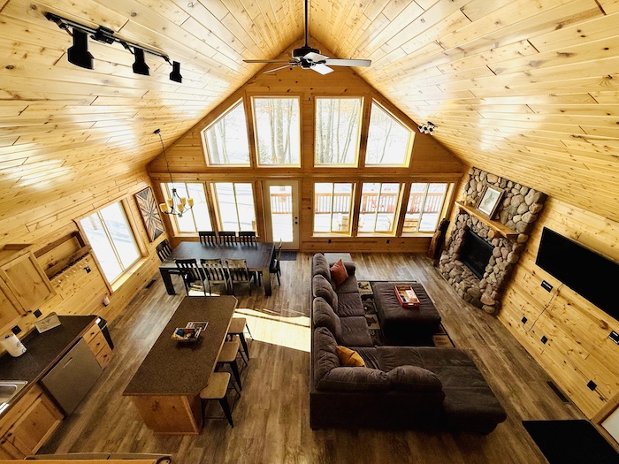 - Cattail Cottage — Intimate charm: stone-faced gas fireplace on main floor (plus another downstairs), knotty-pine warmth, fire pit steps from the house. Sleeps 8.